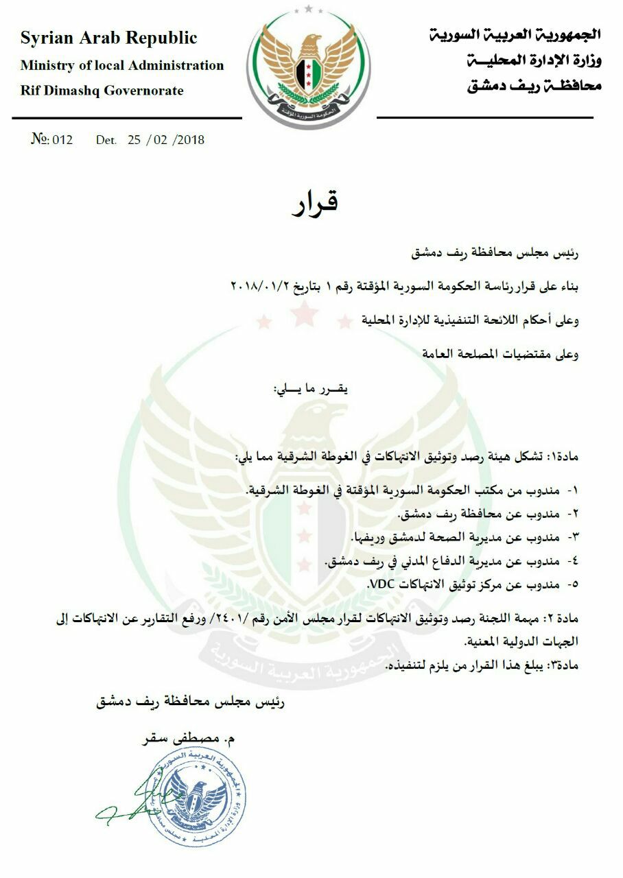 قرار تشكيل هيئة رصد وتوثيق الانتهاكات في الغوطة الشرقية