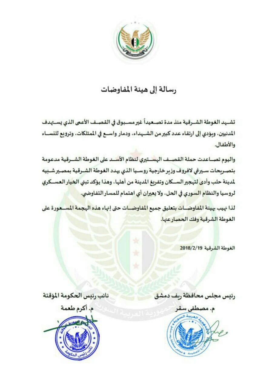 لذا نهيب بهيئة المفاوضات بتعليق جميع المفاوضات حتى إنهاء هذه الهجمة المسعورة على الغوطة الشرقية وفك الحصار عنها.