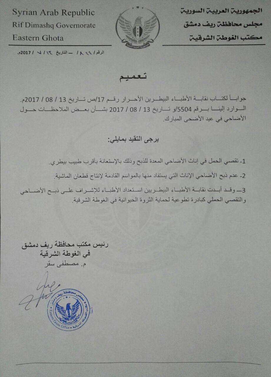 تعميم من مجلس محافظة ريف دمشق بمنع ذبح إناث المواشي حفاظاً على الثروة الحيوانية