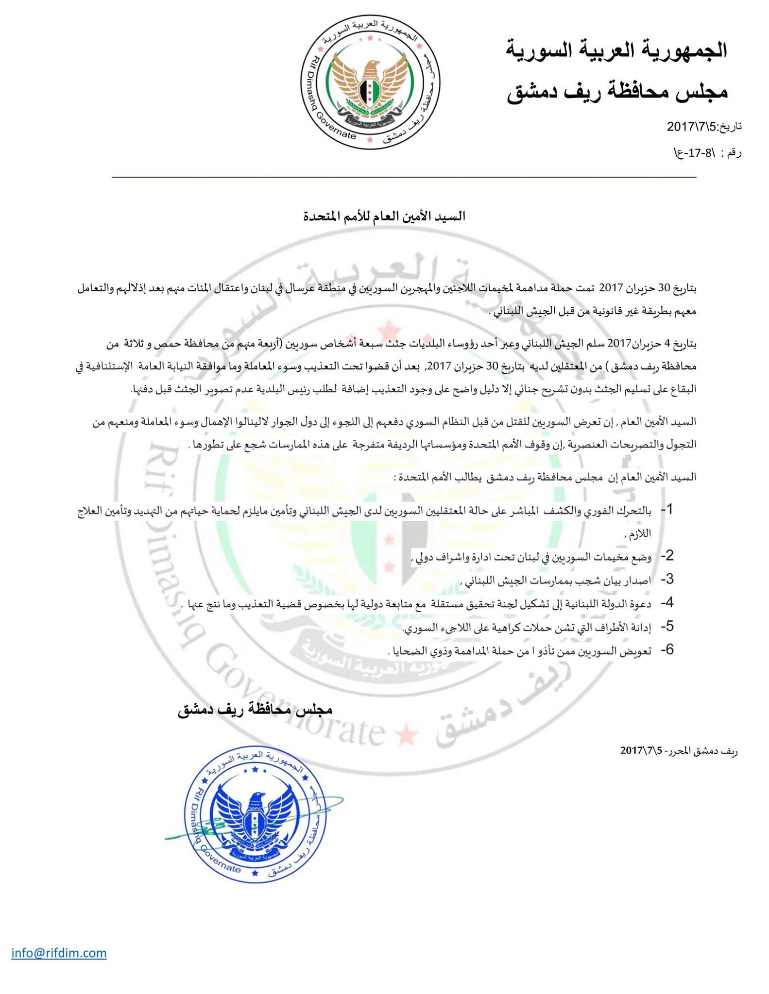 بيان مجلس محافظة ريف دمشق إلى الأمين العام للأمم المتحدة حول ما يتعرض له المهجرين السوريين في جرود عرسال من قبل الجيش اللبناني
