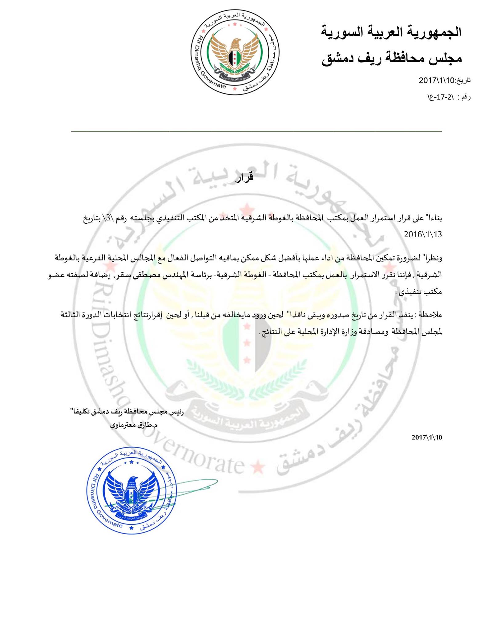 قرار من مجلس محافظة ريف دمشق باستمرار عمل مكتب المحافظة برئاسة المهندس مصطفى سقر