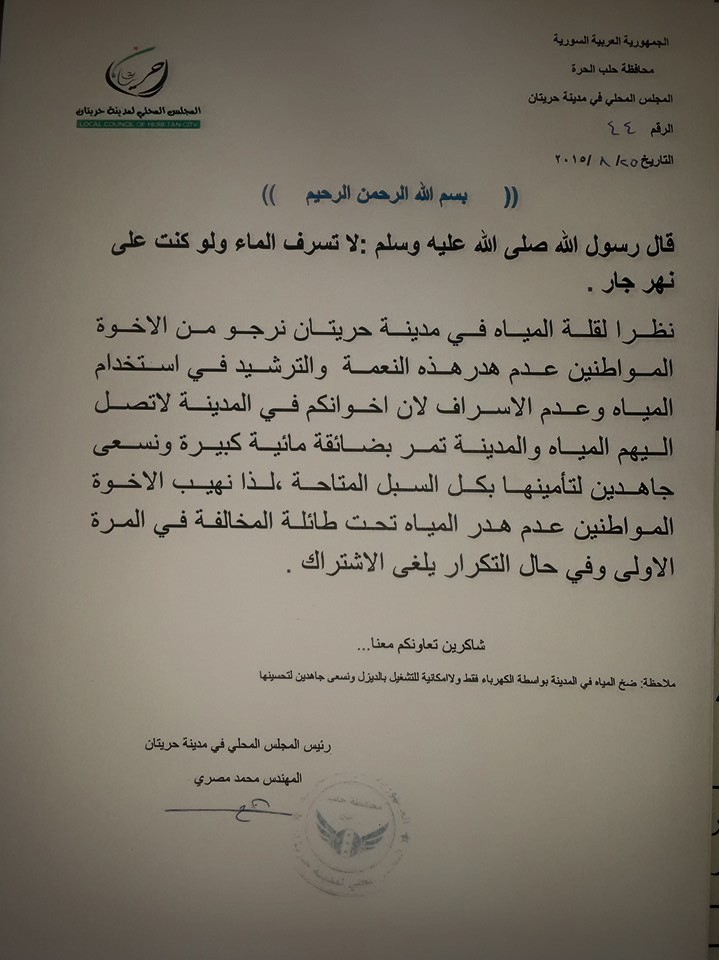 بيان من المجلس المحلي لمدينة حريتان يدعو فيه المواطنين إلى الترشيد في استخدام المياه وعدم الإسراف في استخدامها