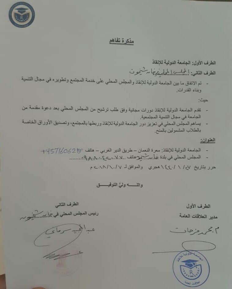مذكرة تفاهم بين المجلس المحلي لمدينة خان شيخون والجامعة الدولية للإنقاذ