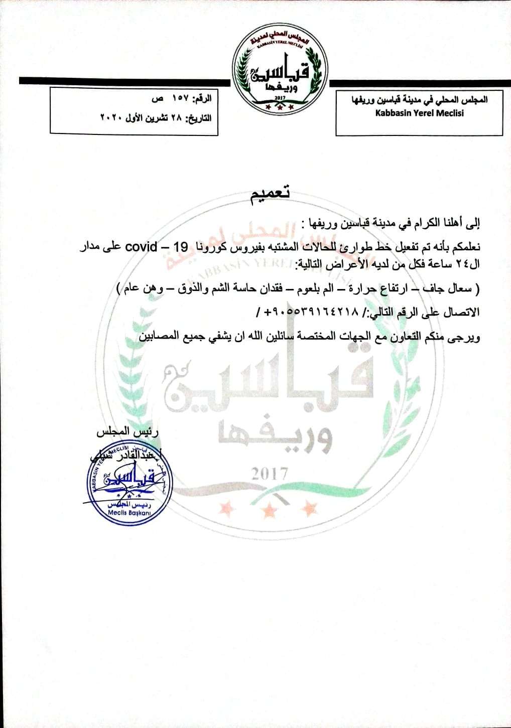 تعميم من المجلس المحلي لمدينة قباسين وريفها حول تفعيل خط الطوارئ للحالات المشتبه بإصابتها بفيروس كورونا