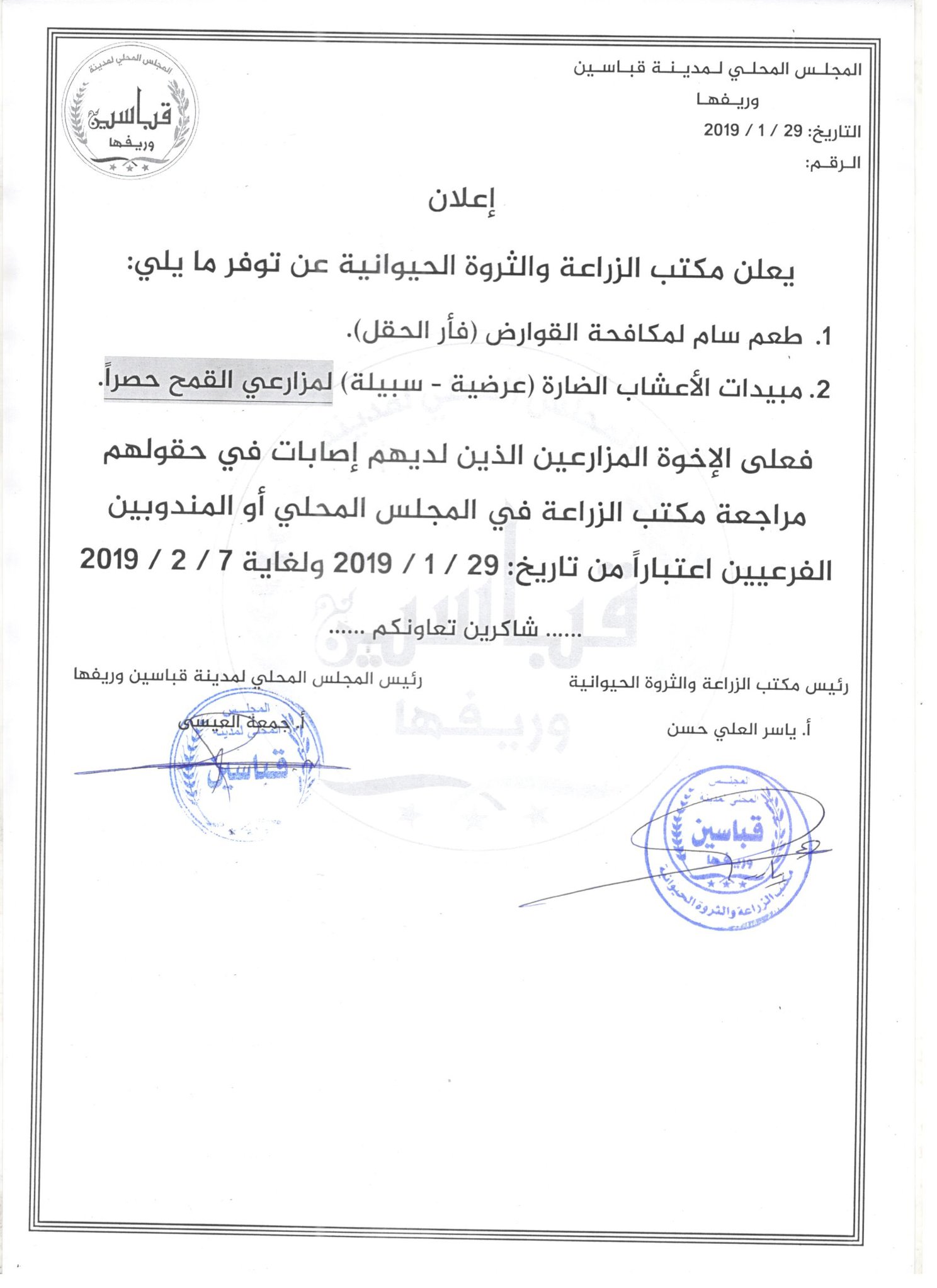 إعلان من مكتب الزراعة والثروة الحيوانية في المجلس المحلي للمزارعين حول توفر مبيدات لمكافحة القوارض والأعشاب الضارة
