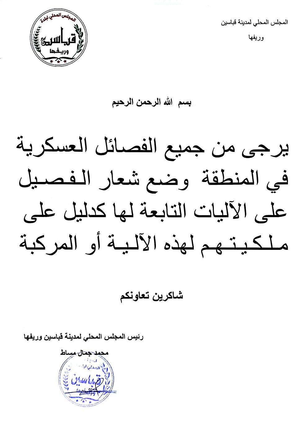 بيان صادر عن المجلس المحلي لمدينة قباسين وريفها يطالب فيه الفصائل بوضع شعارها على الآليات كدليل على ملكيتهم لهذه الآلية