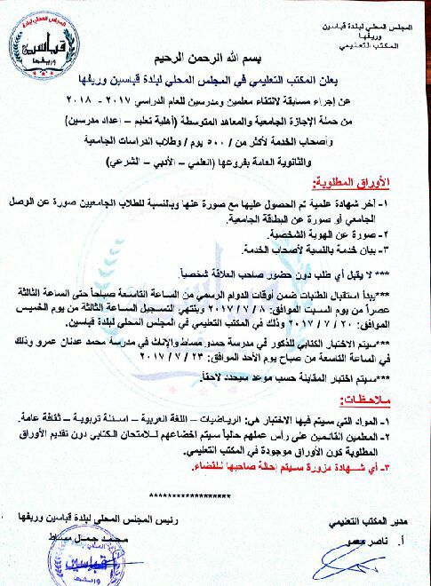 إعلان من المكتب التعليمي في المجلس المحلي حول إجرائه مسابقة لانتقاء معلمين ومدرسين للعام الدراسي 2017 - 2018