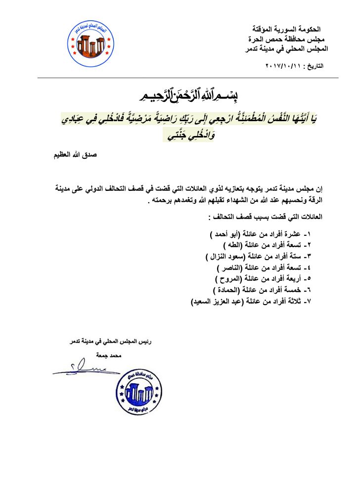 بيان تعزية من المجلس المحلي في مدينة تدمر لأهالي مدينة تدمر بالضحايا الذين قضوا نتيجة قصف التحالف الدولي على المدينة