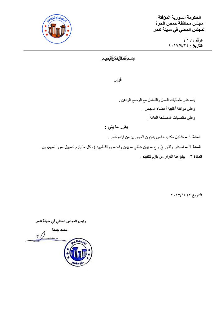 قرار من المجلس المحلي في مدينة تدمر بتشكيل مكتب خاص بشؤون المهجرين من أبناء مدينة تدمر