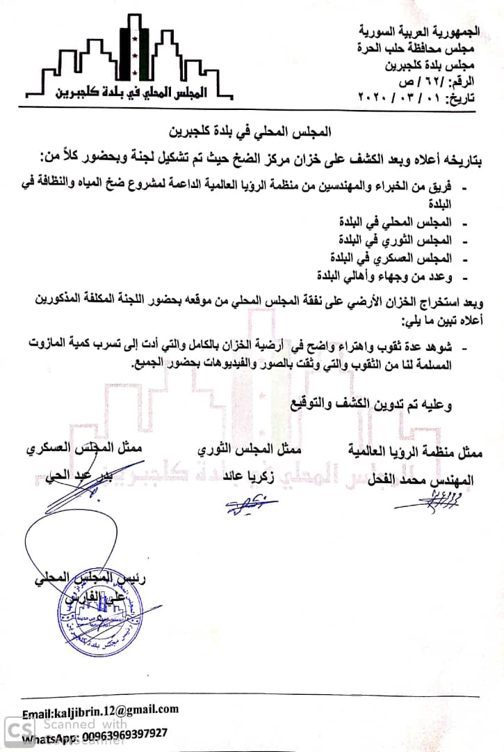 تقرير من المجلس المحلي في بلدة كلجبرين بشأن الكشف على خزان مركز الضخ
