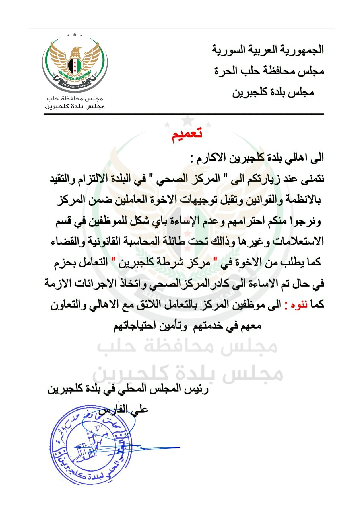 تعميم صادر عن المجلس المحلي يحث الاهالي على الالتزام والتقيد بالقوانين عند زيارة المركز الصحي