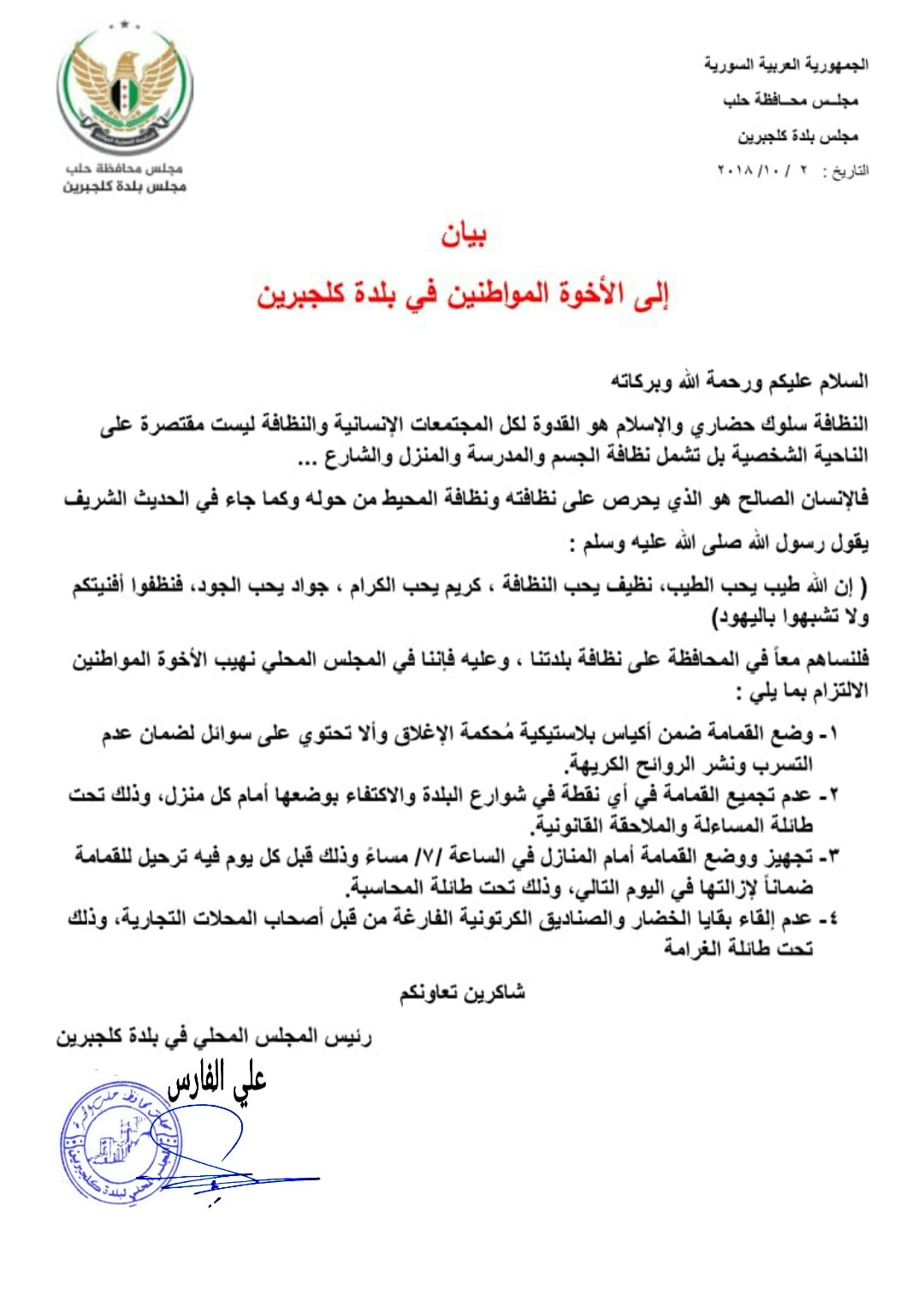 بيان الى الاخوة الاهالي في بلدة كلجبرين يحث على موضوع النظافة والالتزام بالحفاظ على نظافة البلدة