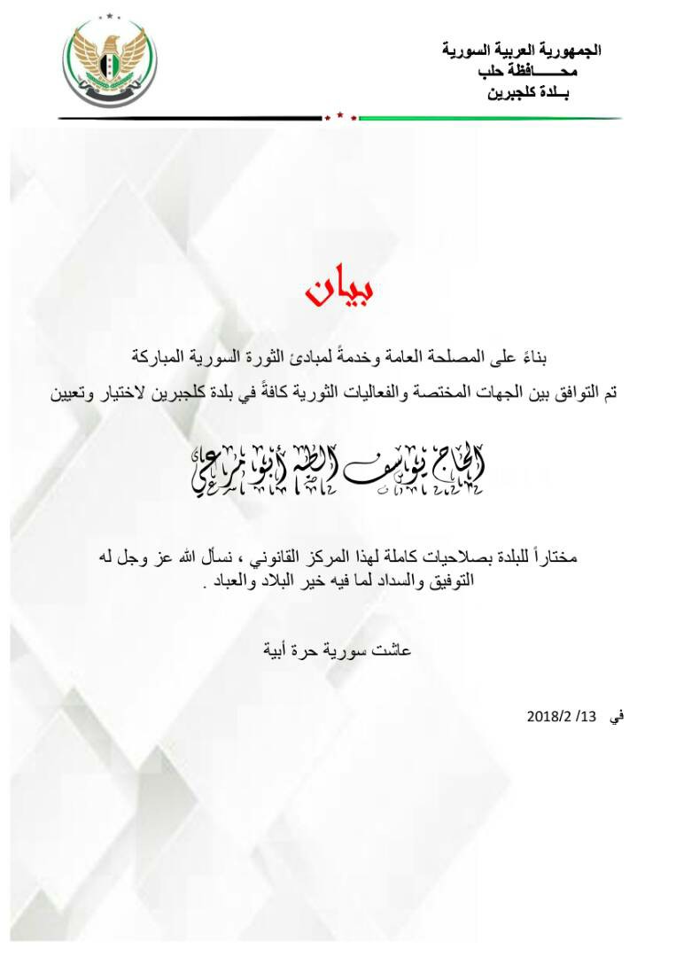 قرار من المجلس المحلي في بلدة كلجبرين تعين الحاج يوسف الطه أبو مرعي مختاراً لبلدة كلجبرين