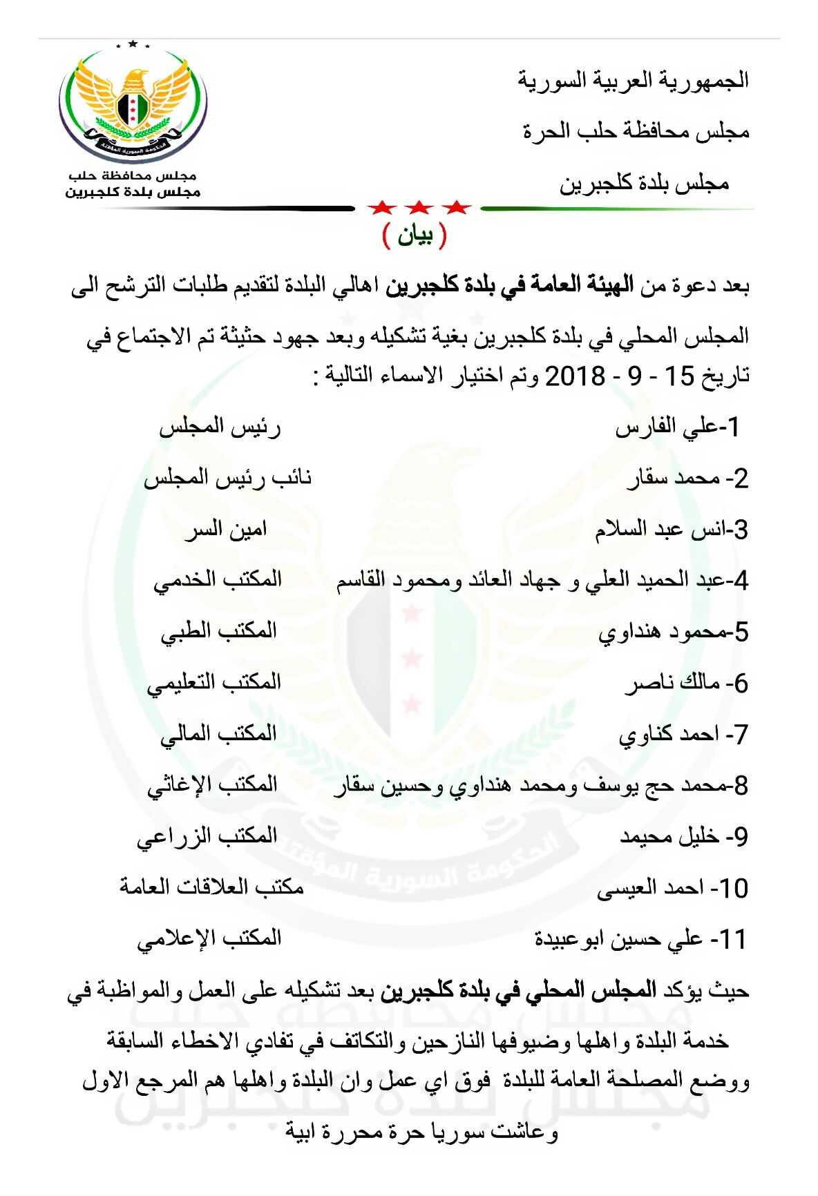 بيان تشكيل المجلس المحلي في بلدة كلجبرين