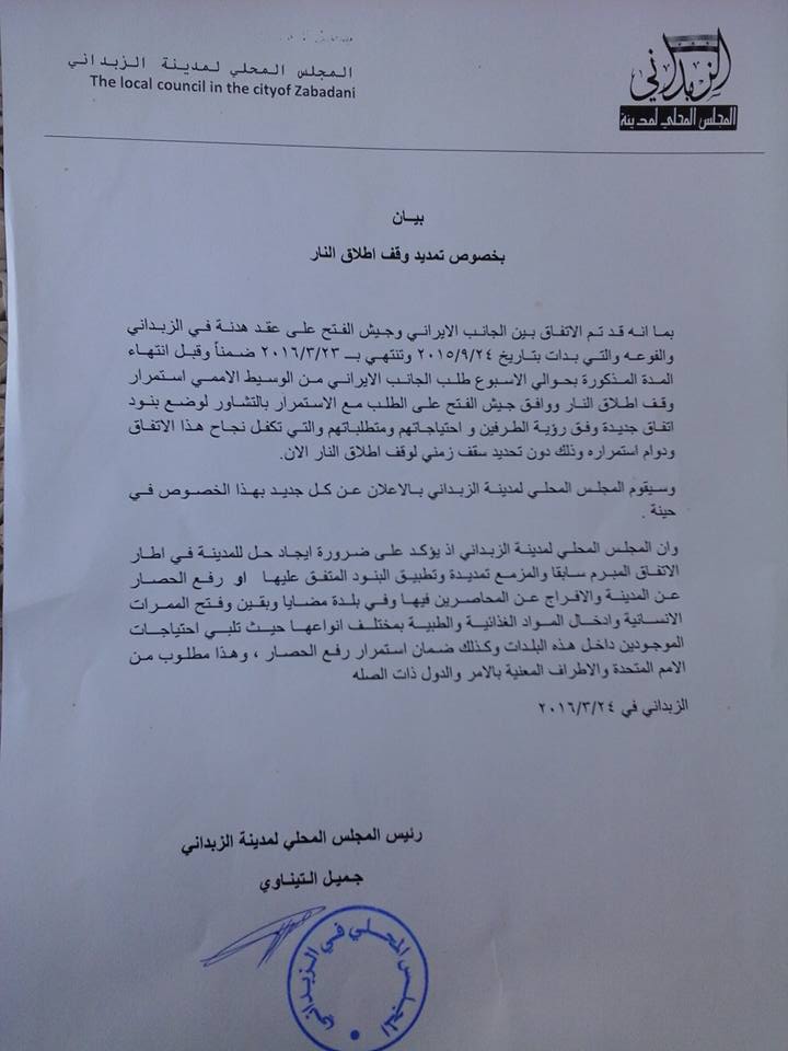 بيان من المجلس المحلي لمدينة الزبداني بخصوص تمديد وقف إطلاق النار