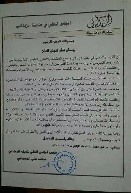 بيان شكر من المجلس المحلي لمدينة الزبداني إلى جيش الفتح على ما قدمه لنصرة مدينة الزبداني