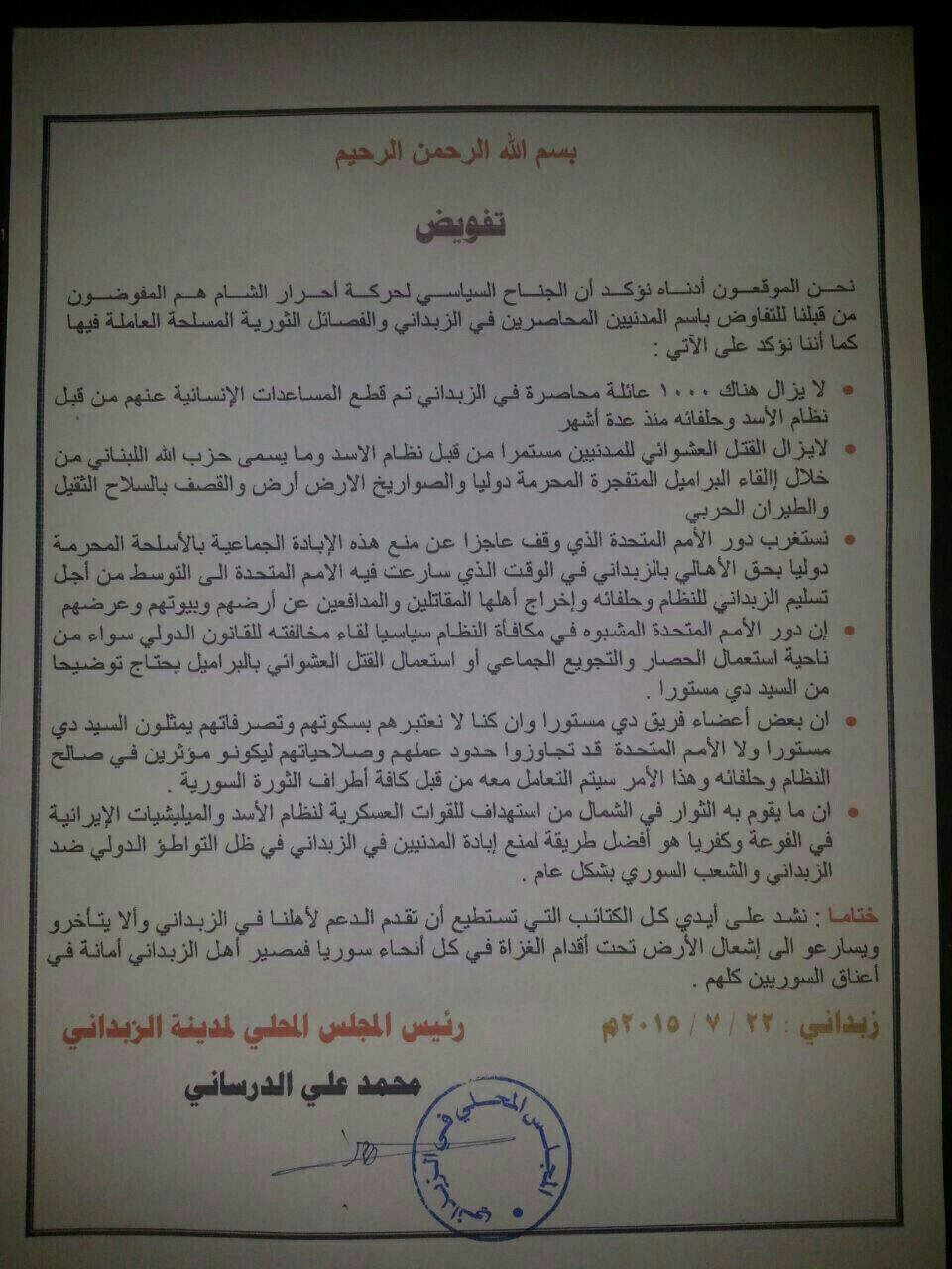 بيان تفويض من المجلس المحلي لمدينة الزبداني لحركة أحرار الشام بالتفاوض باسم المحاصرين
