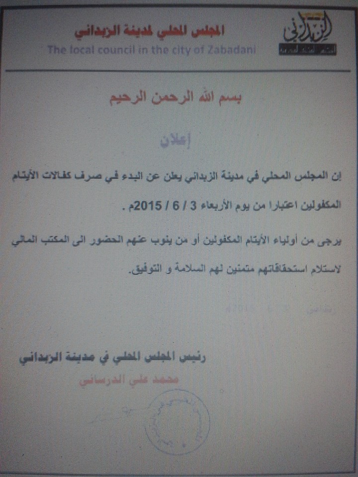 إعلان من المجلس المحلي في مدينة الزبداني بالبدء في صرف كفالات الأيتام المكفولين اعتبارا من 3/6/2015