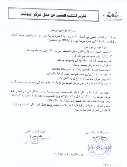 تقرير صادر عن المجلس المحلي في بلدة معرة حرمة حول مشروع دعم مركز التوليد من قبل لجنة تمكين