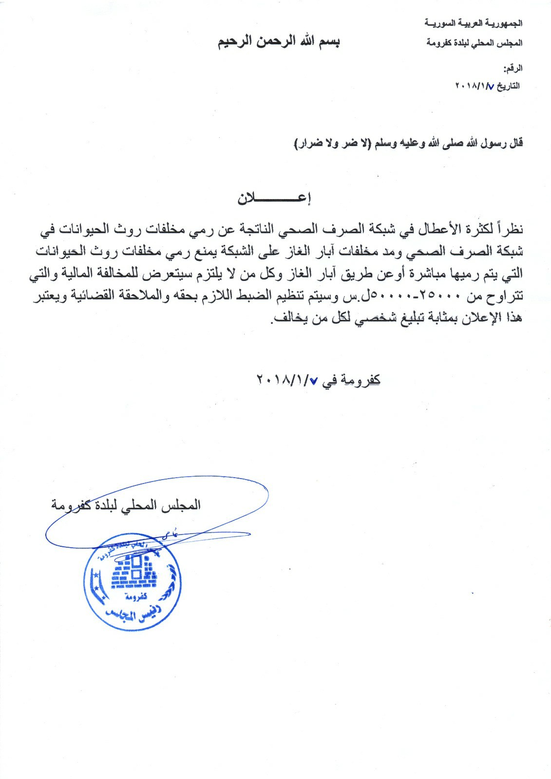 إعلان من المجلس المحلي لبلدة كفروما بمنع رمي مخلفات وروث الحيوانات في شبكة الصرف الصحي