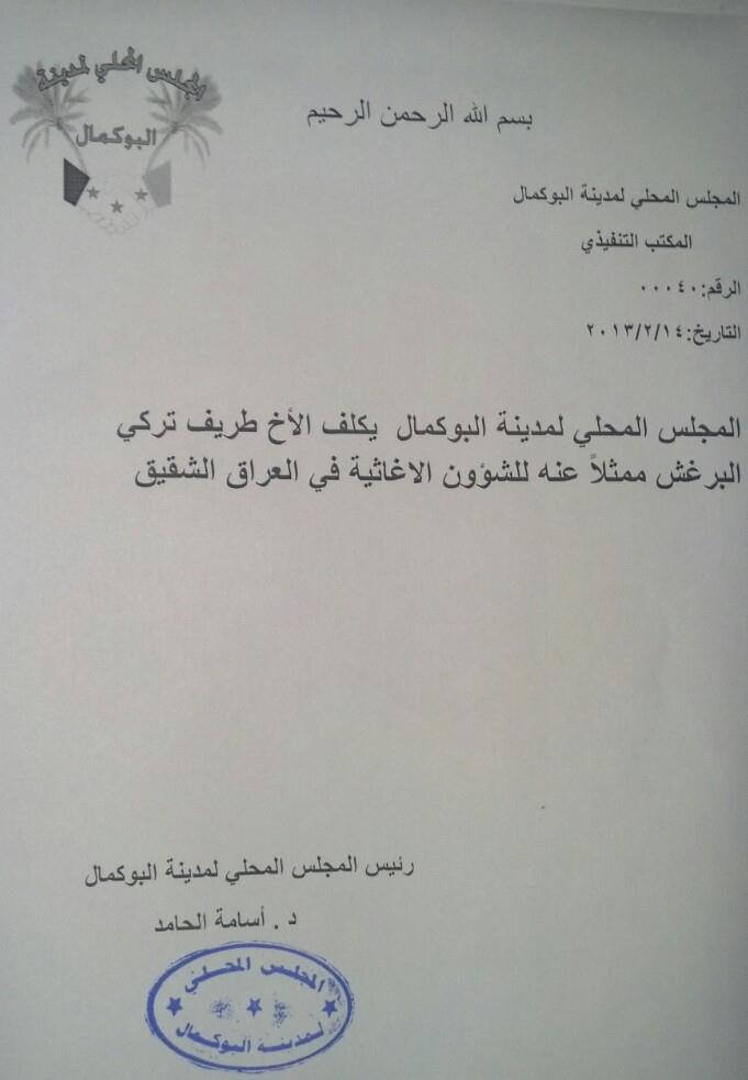 قرار من المجلس المحلي لمدينة البوكمال بتكليف طريف تركي البرغش ممثلاً عنه للشؤون الإغاثية في العراق