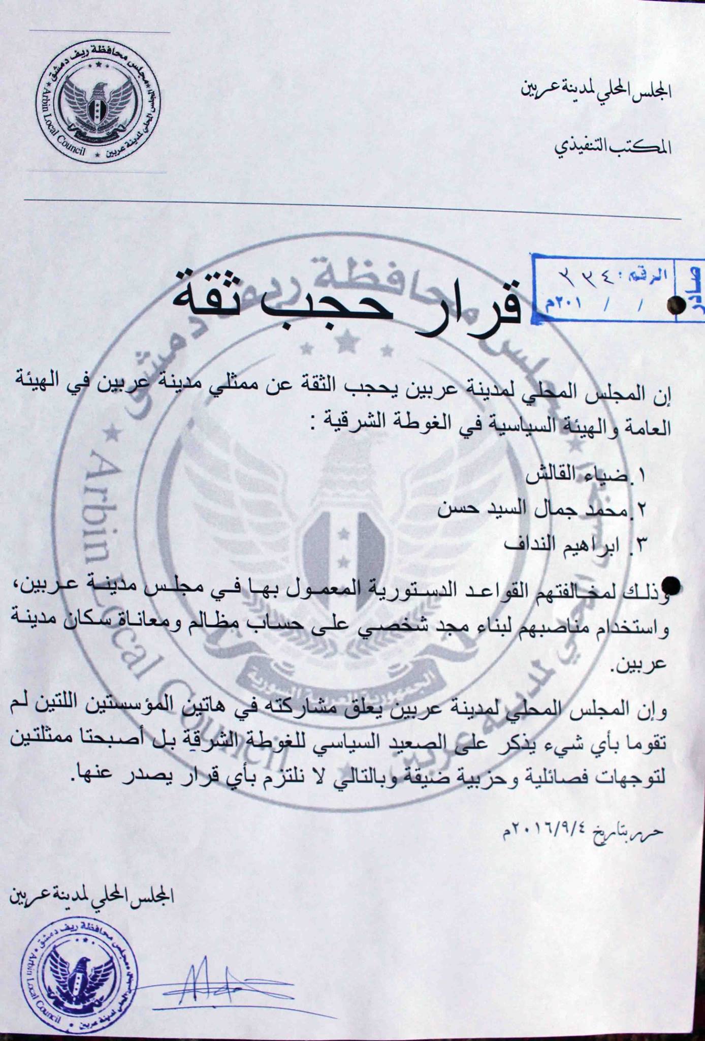 إن المجلس المحلي لمدينة عربين يحجب الثقة عن ممثلي مدينة عربين في الهيئة العامة والهيئة السياسية في الغوطة الشرقية :