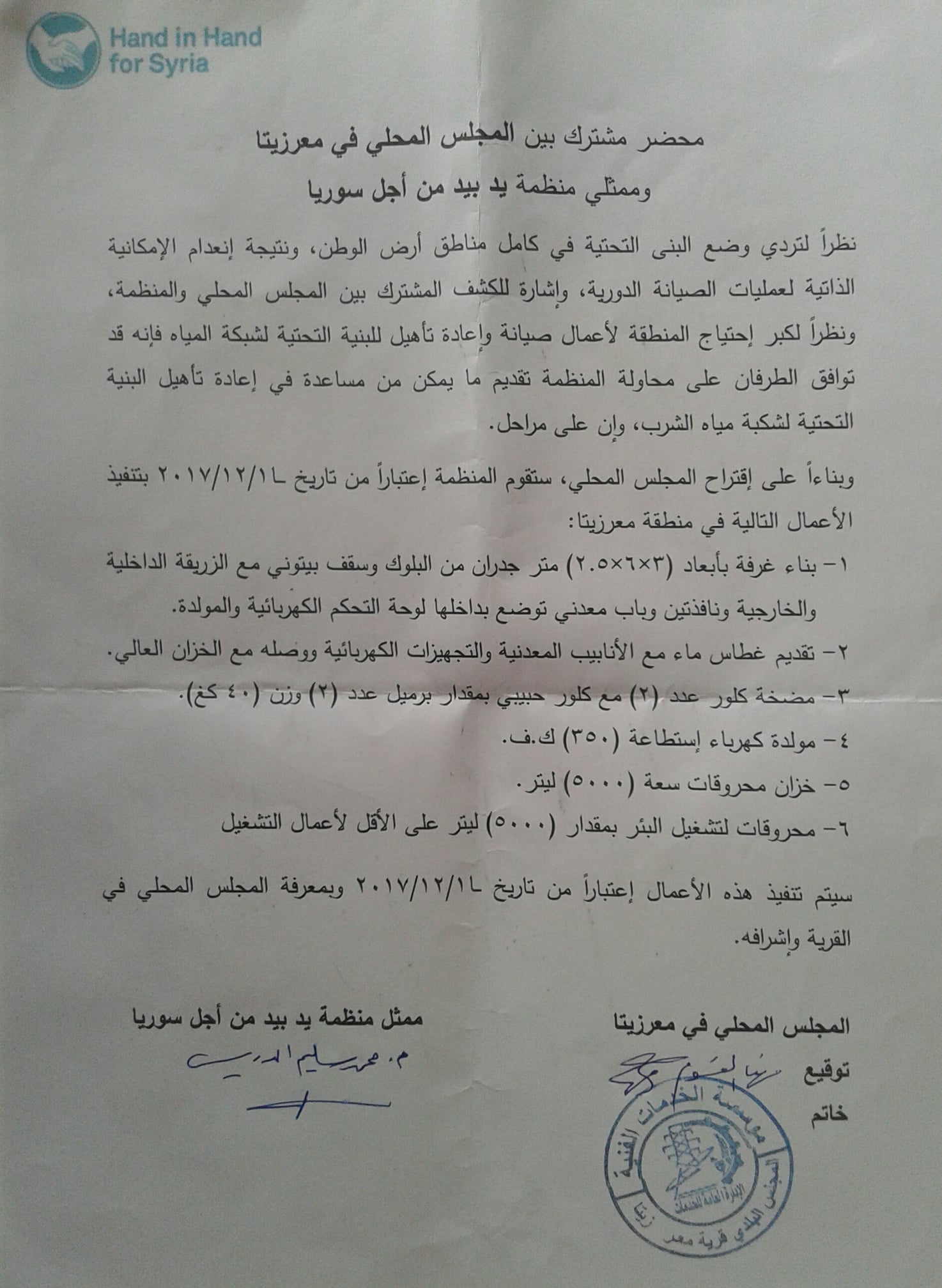 بيان حول الإتفاق بين المجلس المحلي في قرية معرزيتا و منظمة hand in hand على تركيب مضخة مياه كاملة لتأمين مستلزمات القرية من المياه
