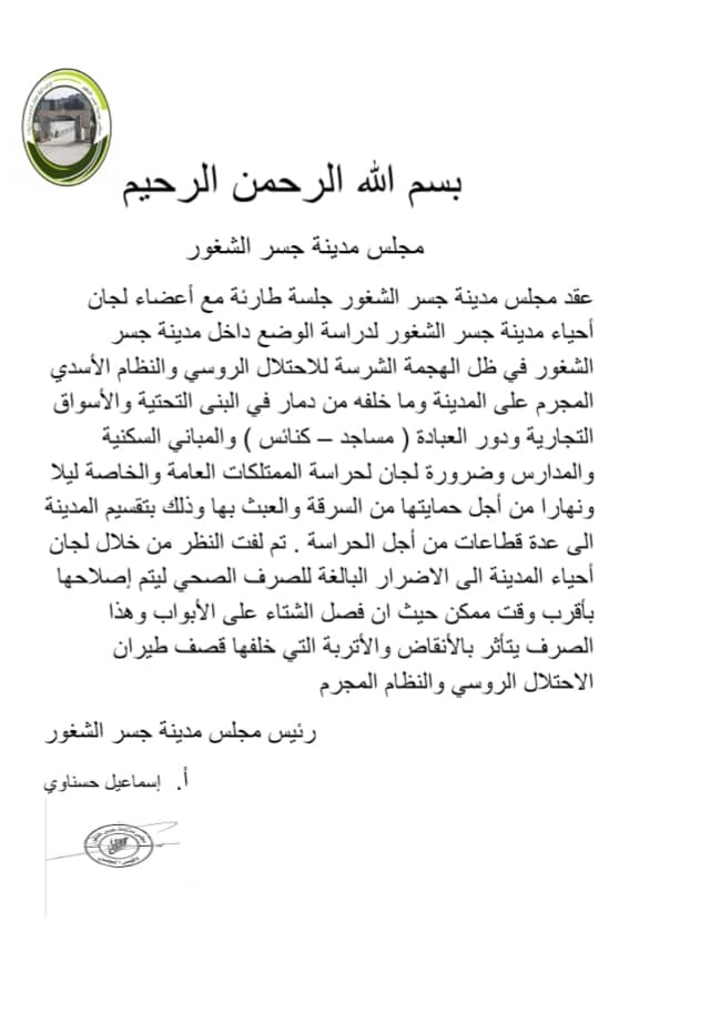 بيان من مجلس مدينة جسر الشغور حول الإجتماع الذي عقده مع لجان الأحياء لدراسة الأوضاع داخل المدينة