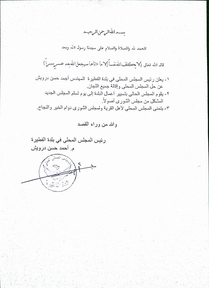 بيان حول قرار حل المجلس المحلي في بلدة الفطيرة وتعليق أعماله إلى حين تشكيل مجلس جديد