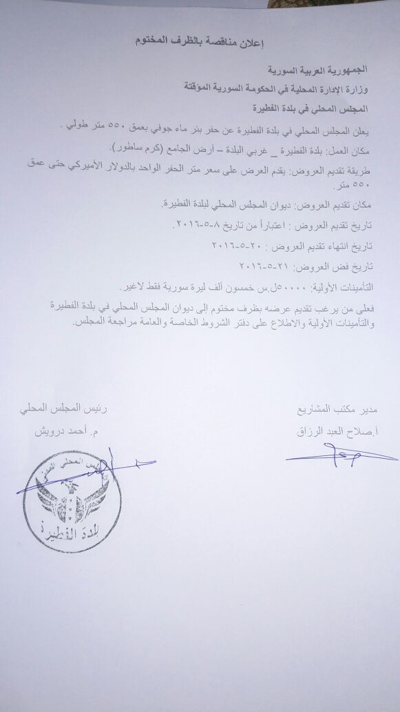 إعلان من المجلس المحلي في بلدة الفطيرة عن مناقصة من أجل حفر بئر ماء جوفي بعمق 550 متر