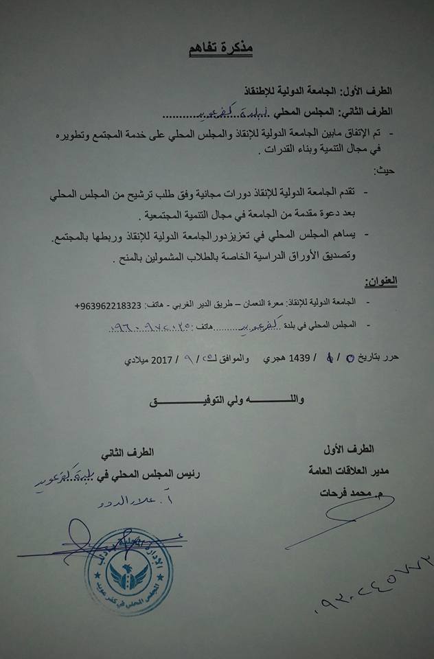بيان حول مذكرة التفاهم الموقعة بين المجلس المحلي لبلدة كفرعويد والجامعة الدولية للإنقاذ