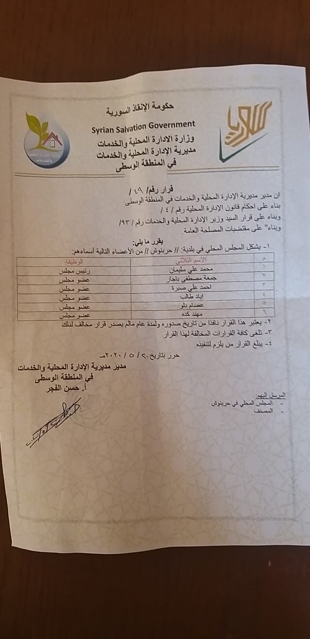 قرار مديرية الإدارة المحلية والخدمات في المنطقة الوسطى بخصوص تشكيل المجلس المحلي في بلدة حربنوش