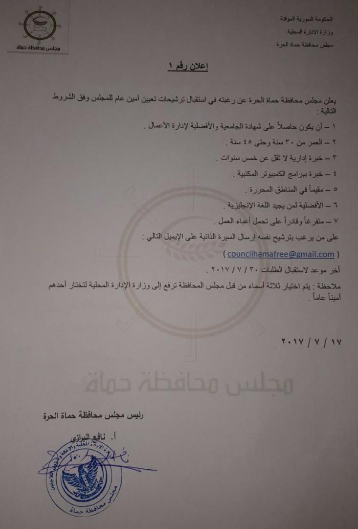 إعلان من مجلس محافظة حماة ببدء استقبال ترشيحات أمين عام للمجلس