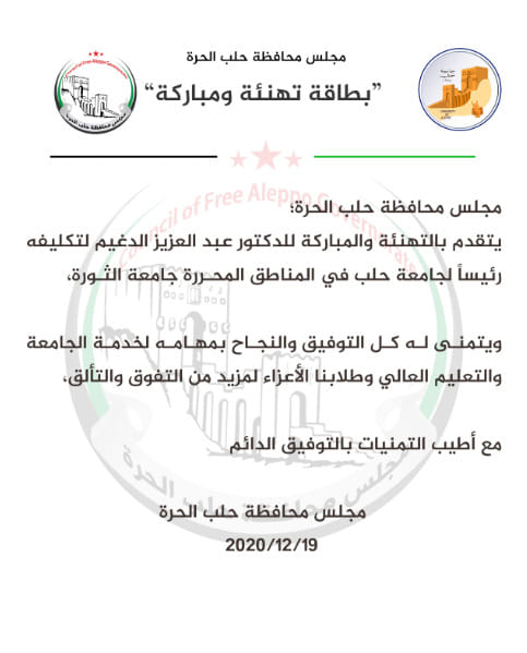 بيان من مجلس محافظة حلب الحرة يهنئ فيه الدكتور عبد العزيز الدغيم بتكليفه رئاسة جامعة حلب الحرة