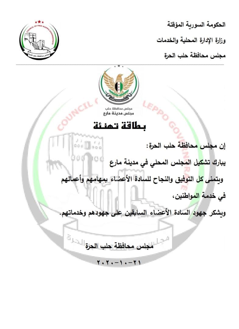بيان من مجلس محافظة حلب الحرة يبارك فيه تشكيل المجلس المحلي في مدينة مارع