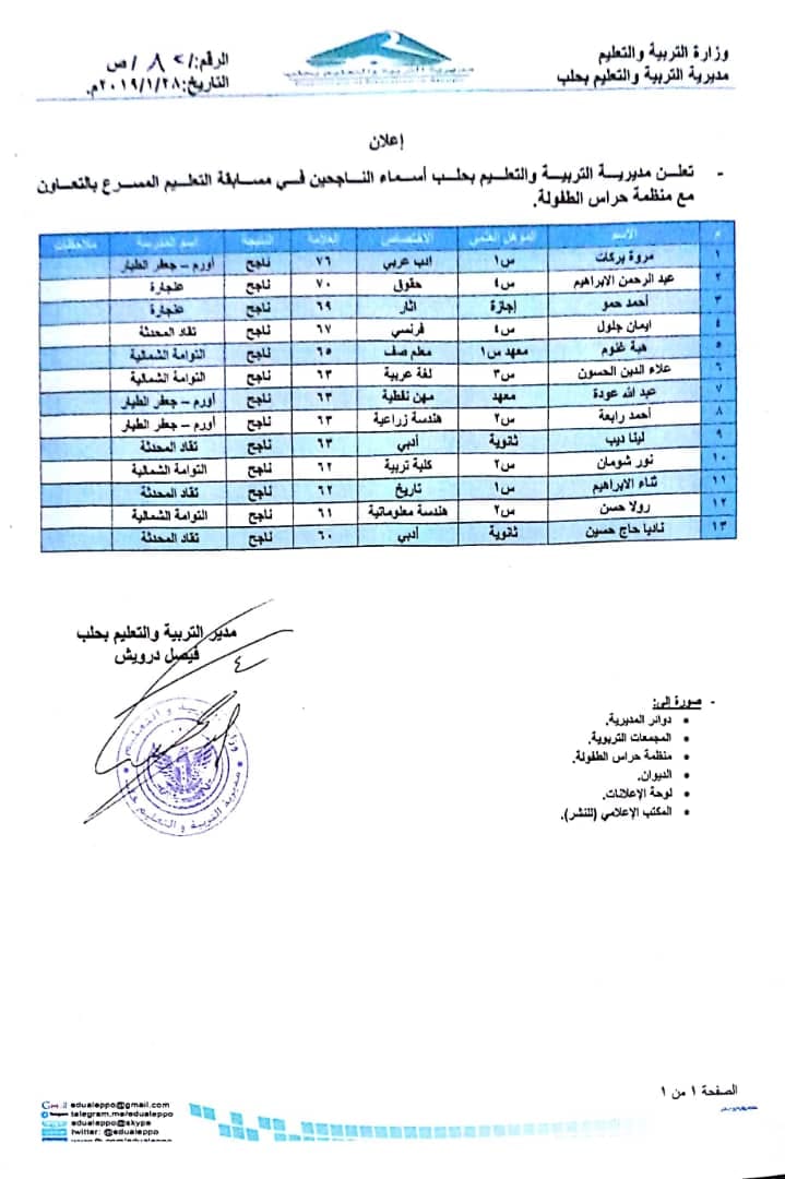 بيان من مديرية التربية و التعليم بحلب تعلن فيه أسماء الناجحين في مسابقة التعليم المسرع التي أجرتها بالتعاون مع منظمة حراس الطفولة