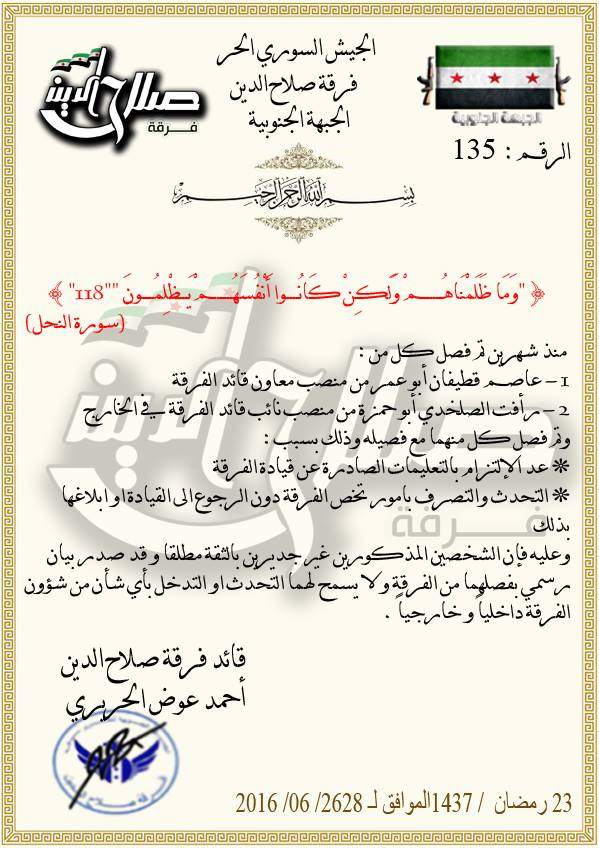 قرار من فرقة صلاح الدين بفصل معاون قائد الفرقة عاصم قطيفان ونائب قائد الفرقة في الخارج رأفت الصلخدي