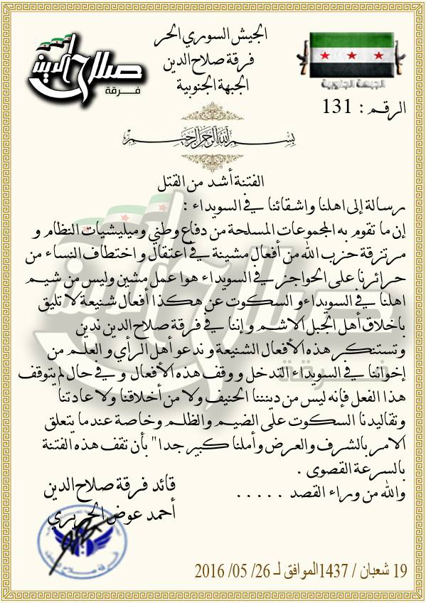 بيان من فرقة صلاح الدين إلى أهالي السويداء حول تقوم به مليشيا الدفاع الوطني من اعتقال واختطاف النساء على حواجز المدينة