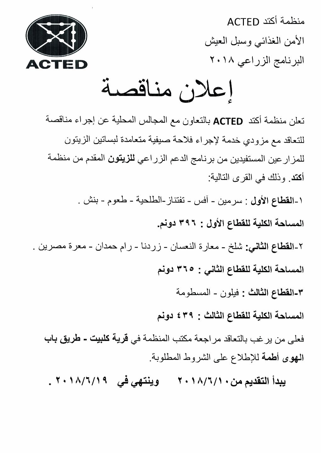 إعلان مناقصة من منظمة ACTED لإجراء فلاحة صيفية متعامدة لبساتين الزيتون
