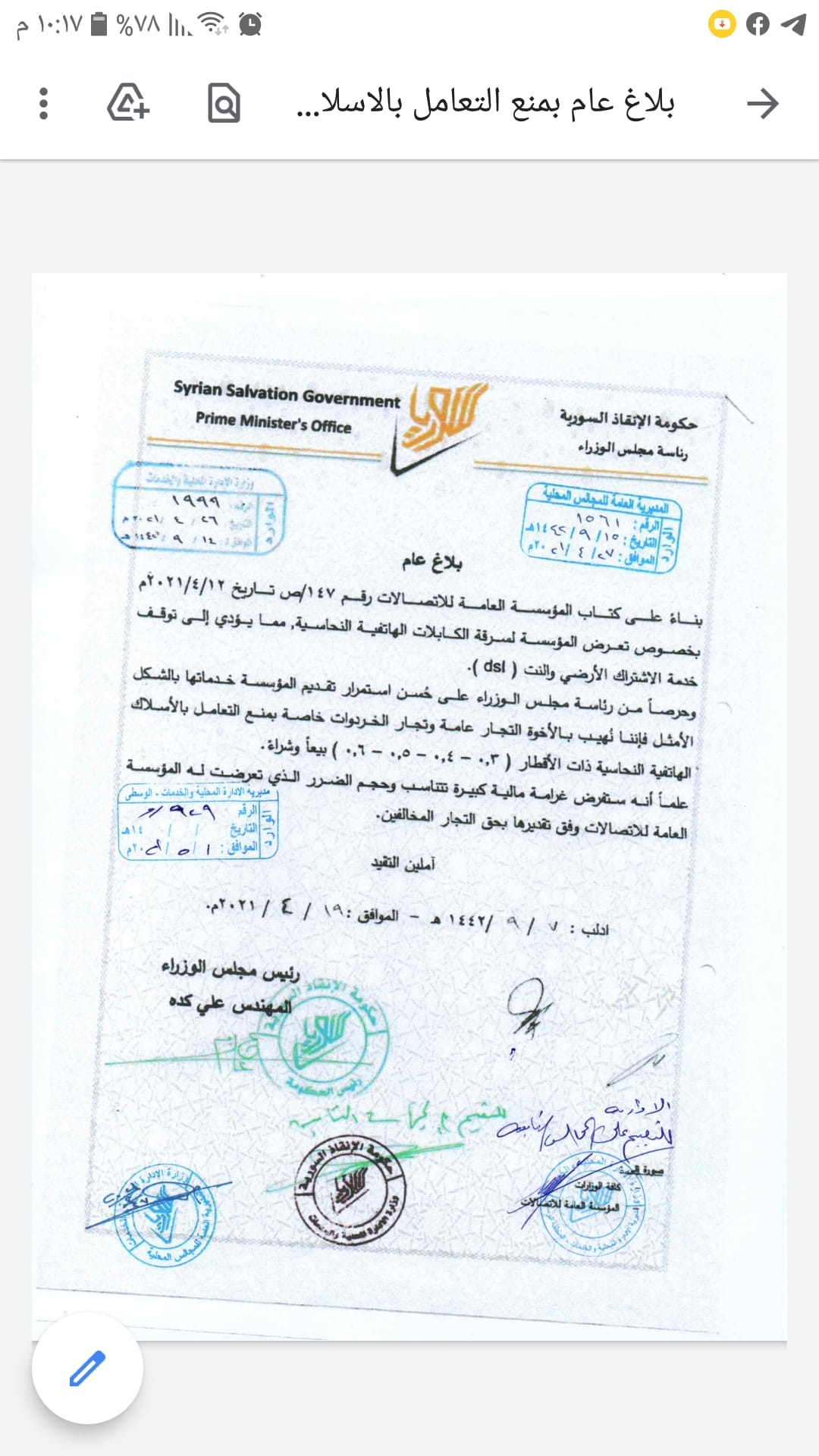 تعميم من حكومة الإنقاذ السورية بمنع التعامل بالأسلاك الهاتفية النحاسية ذات أقطار معينة