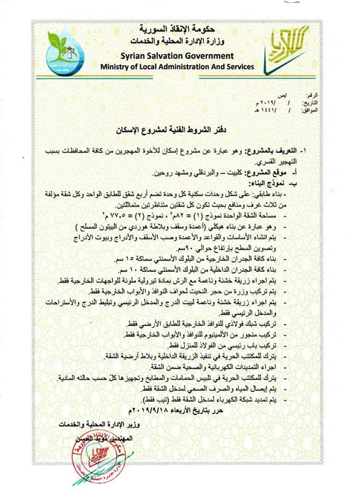 بيان من وزارة الإدارة المحلية في حكومة الإنقاذ بشأن دفتر شروط مشروع الإسكان للمهجرين