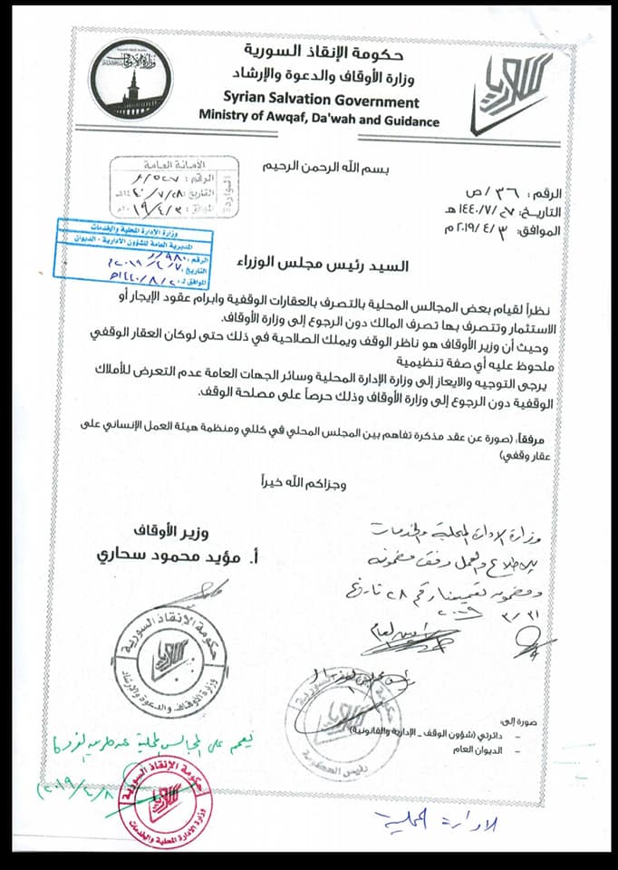 تعميم من وزارة الأوقاف في حكومة الإنقاذ السورية لسائر الجهات العامة بعدم التعرض للأملاك الوقفية دون الرجوع للوزارة