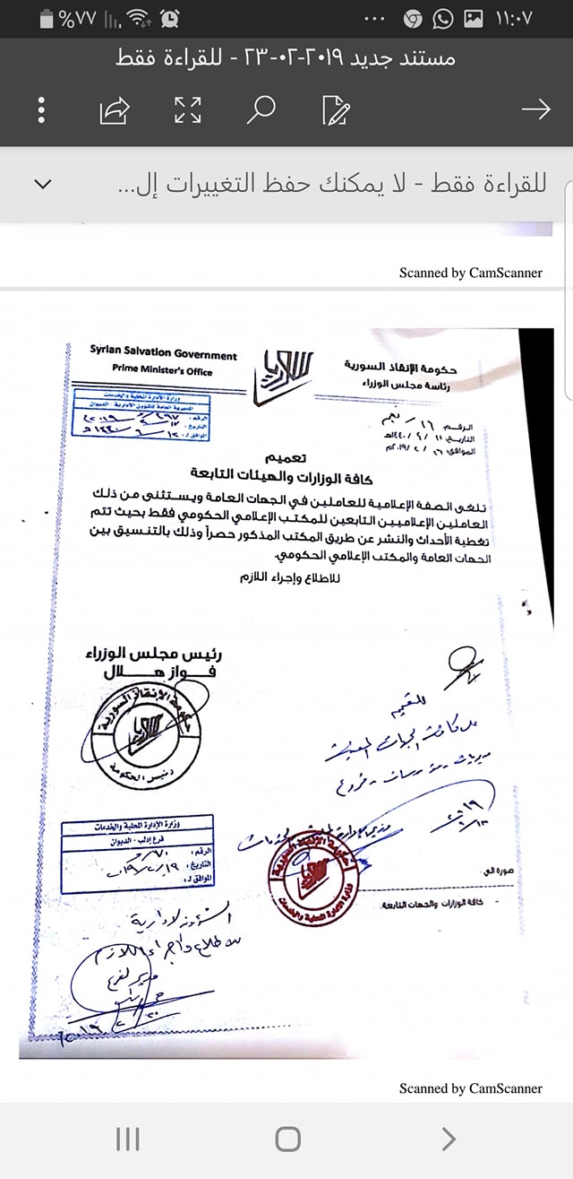 تعميم من حكومة الإنقاذ السورية إلى كافة الوزارات والهيئات التابعة بإنهاء الصفة الإعلامية للعاملين في الجهات العامة باستثناء العاملين التابعين للمكتب الإعلامي