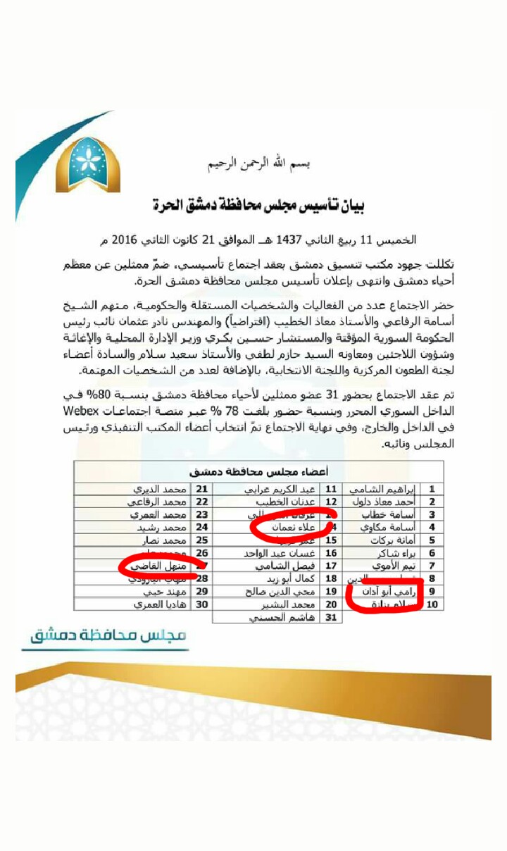 بيان تأسيس مجلس محافظة دمشق الحرة