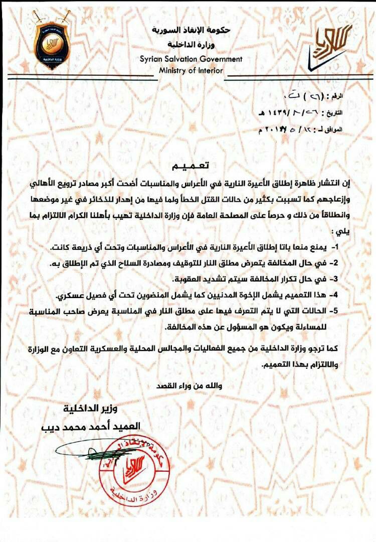 تعميم من وزارة الداخلية في حكومة الإنقاذ بمنع إطلاق النار في المناسبات