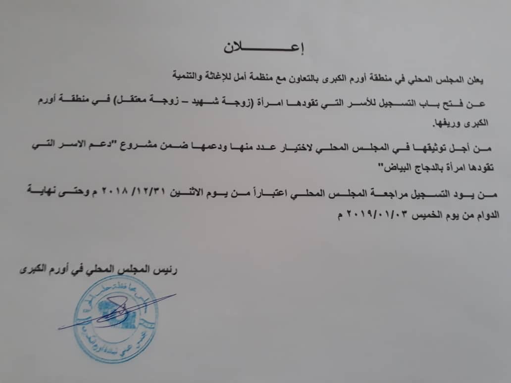 إعلان من المجلس المحلي لبلدة اورم الكبرى حول فتح باب التسجيل للأسر التي تقودها امرأة وذلك بالتعاون مع منظمة أمل للإغاثة والتنمية