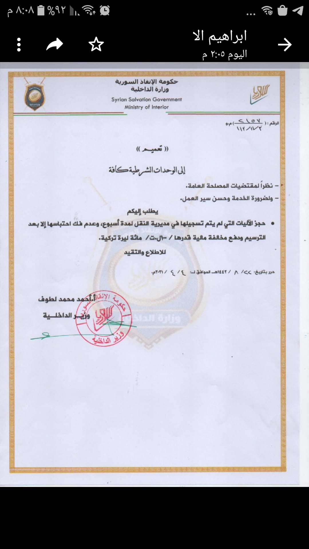 تعميم وزارة الداخلية في حكومة الإنقاذ إلى الوحدات الشرطية بحجز كل آلية لم يتم تسجيلها وترسيمها في مديرية النقل