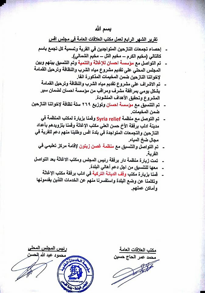 تقرير عمل مكتب العلاقات العامة في المجلس المحلي لبلدة آفس خلال شهر نيسان/إبريل 2018