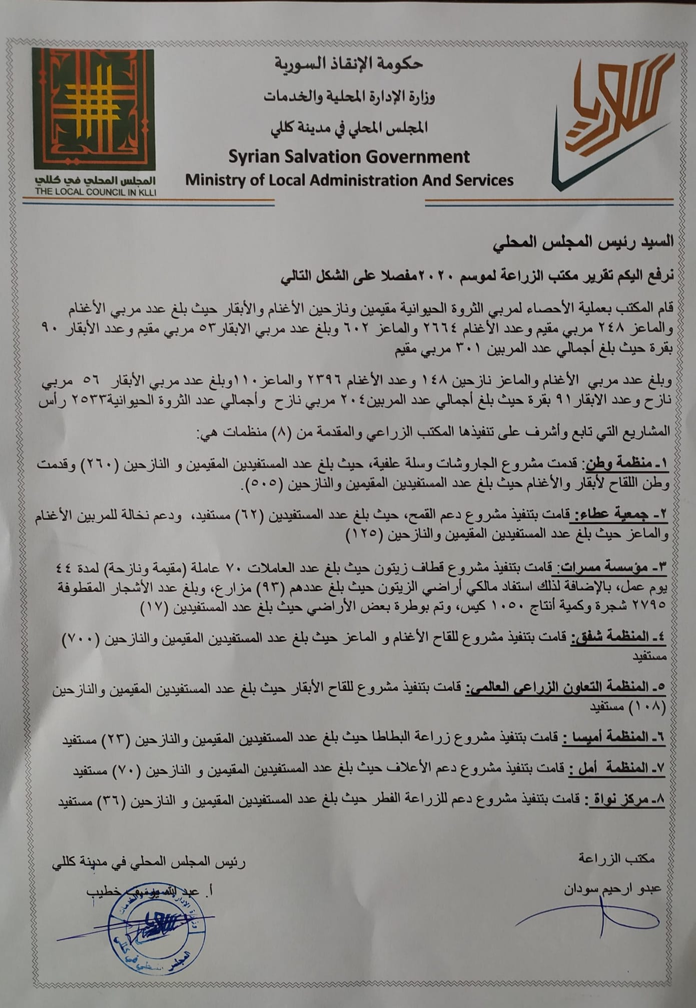 تقرير المجلس المحلي في مدينة كللي عام لعمل مكتب الزراعة في سنة 2020