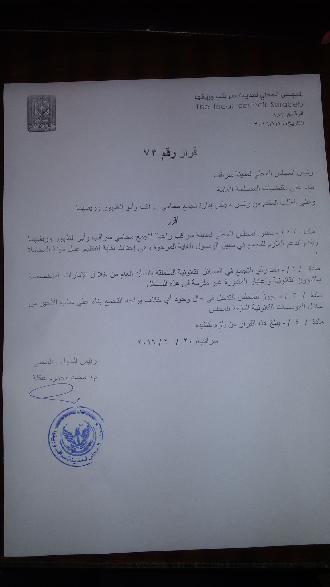قرار من المجلس المحلي لمدينة سراقب وريفها يعتبر فيه المجلس راعيا لتجمع محامي سراقب وأبو ظهور وريفيهما